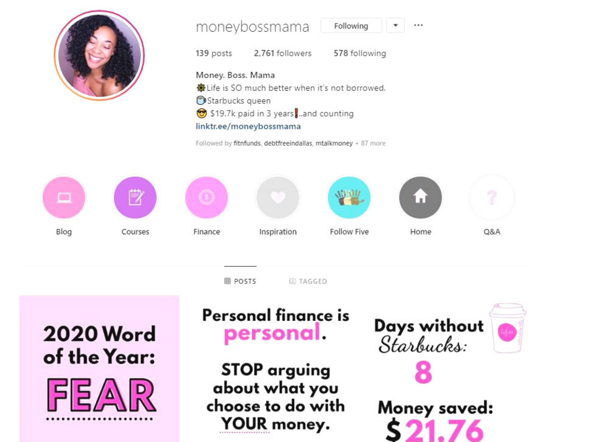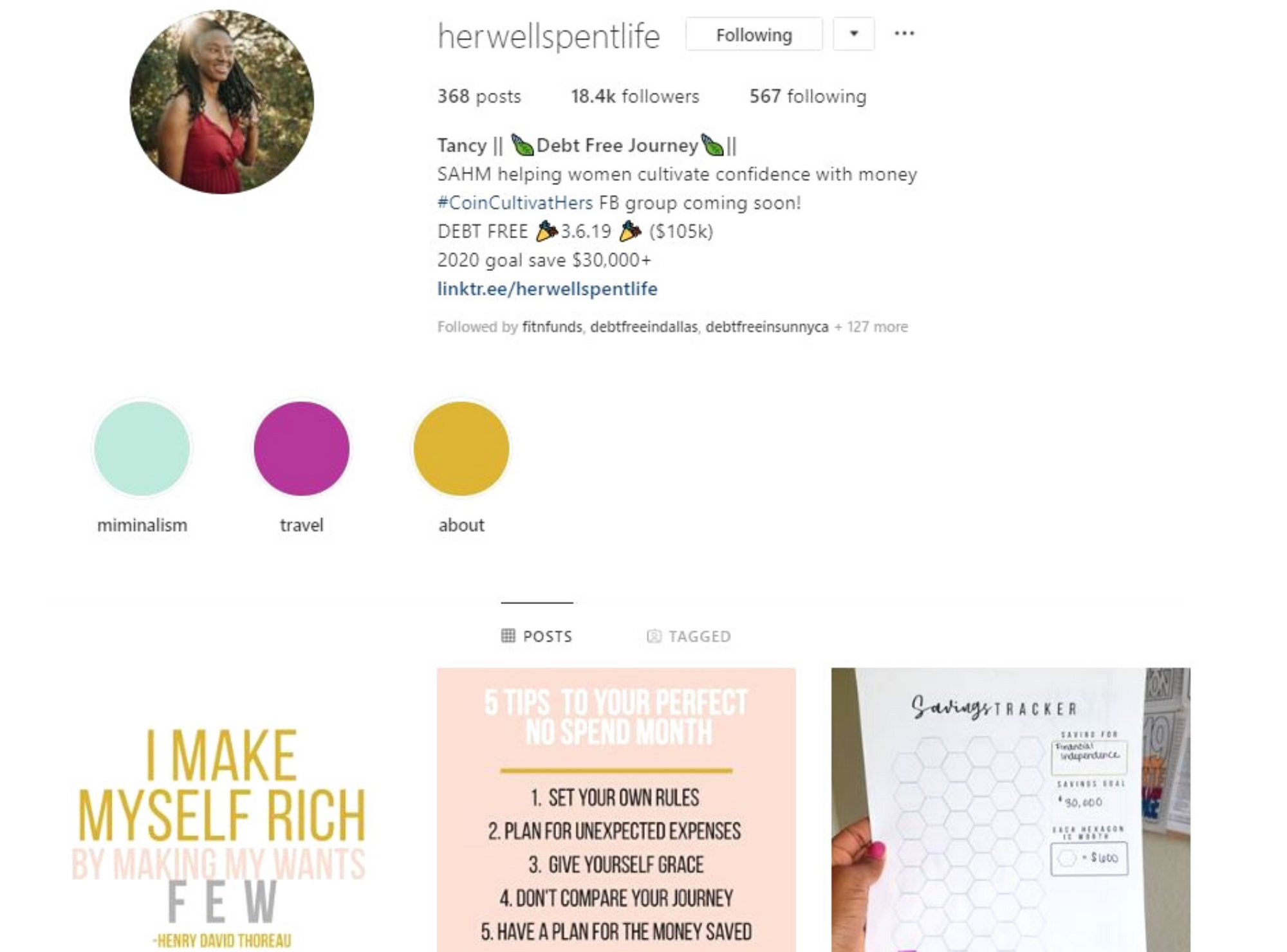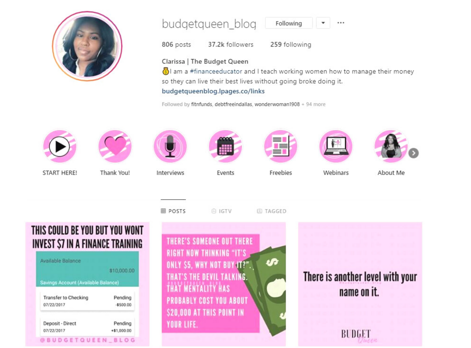 Meet Clarissa The Budget Queen! I met this mom of two on Instagram last year in 2019 and just like the other ladies featured, she is killing it on Instagram. She teaches working women how to manage their money so they can live their best life. To date, she has paid off $43,000 in credit card debt in 16 months. She has also helped over 500 women save up to $10,000. Follow Clarissa as she will teach you how to budget and manage your finances. She offers a wide array of products from eBooks, webinars and one on one coaching sessions that will definitely help you to organize your money.